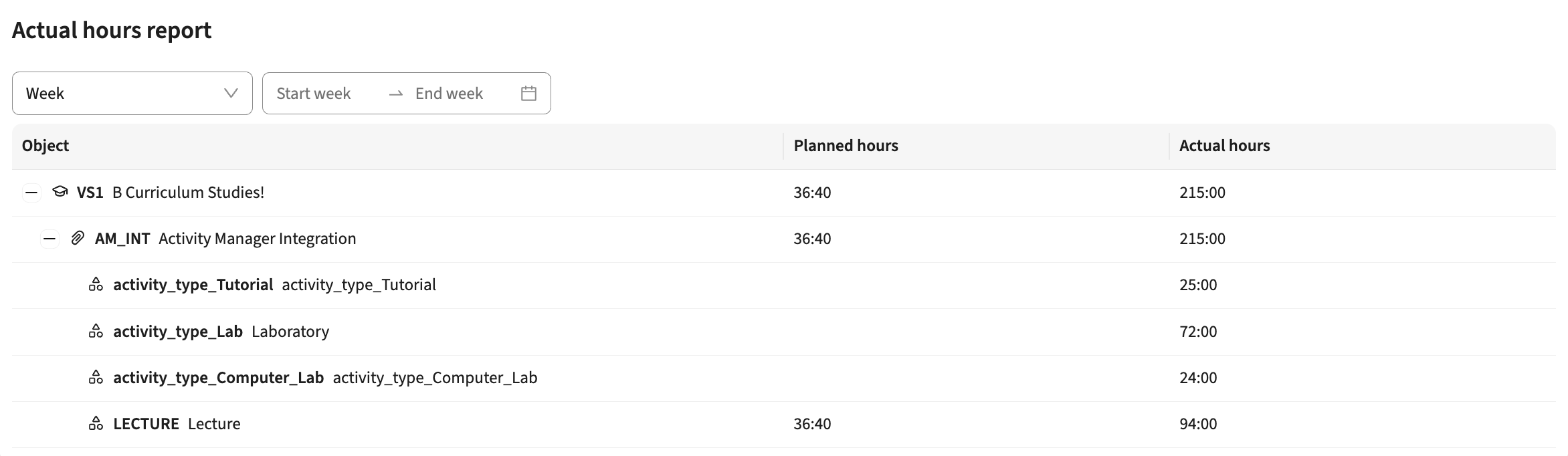 From a 'user' perspective this is not the most useful report, but just for validating the data retrieved the report is ideal. The relevant information used to match the data with the internal Curriculum data (staff member and activity-type) is shown, including the data to filter (select only the last 2 weeks or last month) and the values for calculation (duration) are shown.