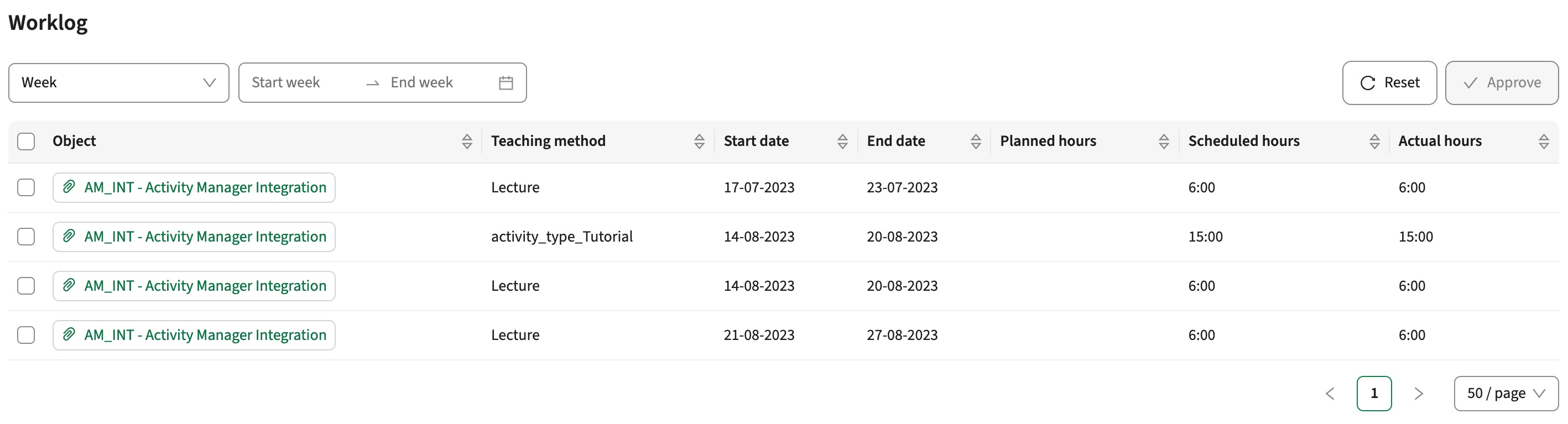 An indicator shows if the actual hours have been approved.